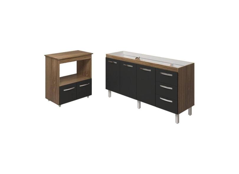 Balcão Cozinha Armário Gabinete De Pia 160 Cm Estela E Balcão Para Forno Elétrico E Microondas Amanda Savana Preto