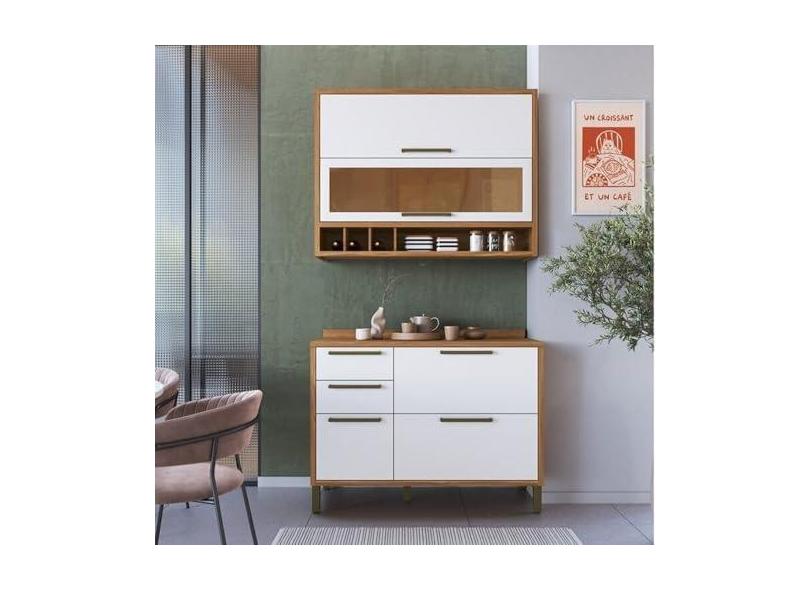 Cozinha Compacta 120cm com 2 Peças Vidro Reflecta e 3 Gavetas 100% Mdf Vicenza Espresso Móveis Amêndoa/Branco