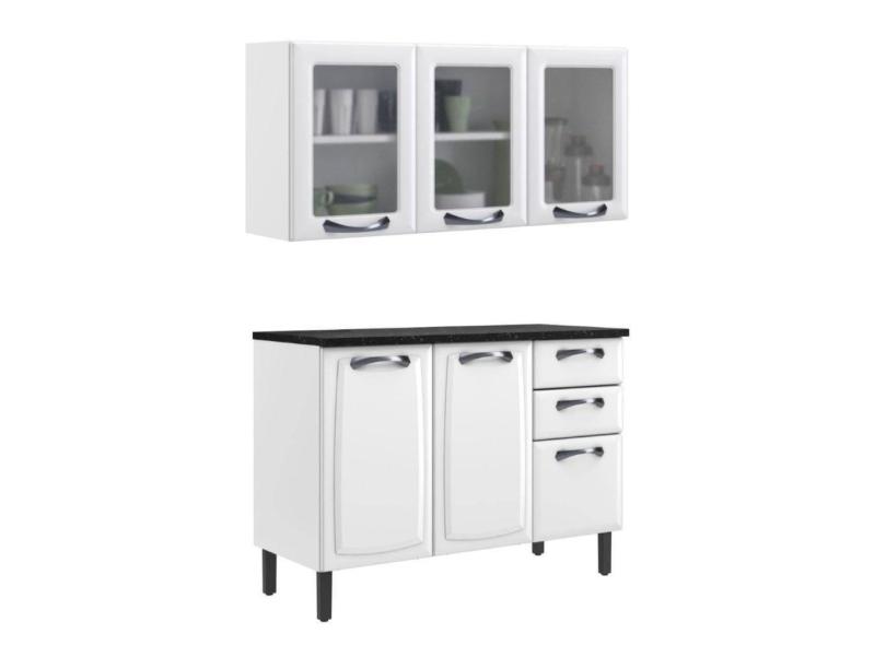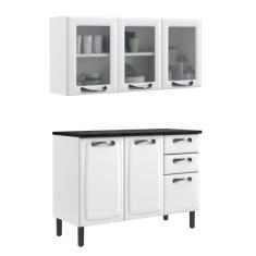 Cozinha Modulada 2 Peças Itatiaia Balcão 3 Portas e Armário Aéreo 3 Portas em Vidro Aço New Premium Branco