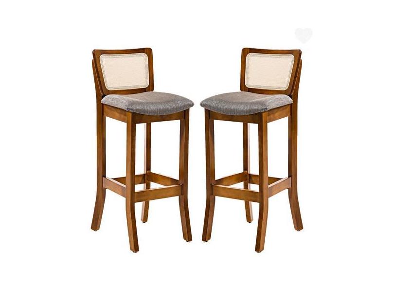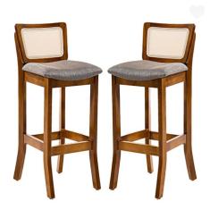 Kit 2 Banquetas Alta com Encosto Rattan Portugal Estofada Linho Cinza