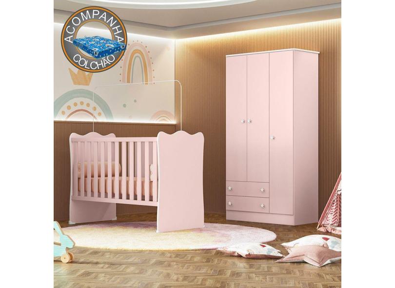 Quarto de Bebê Doce Sonho com Roupeiro 2617 e Berço Simples 1 Qmovi Rosa Acetinado + Colchão Ortobom