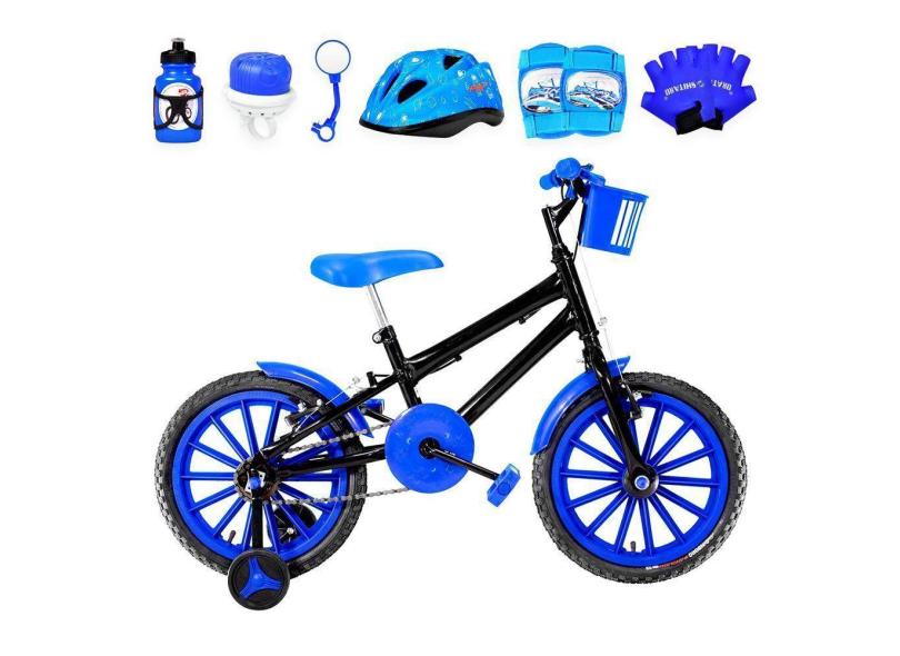 Bicicleta Infantil Aro 16 Nylon + Kit Proteção Preta e Azul