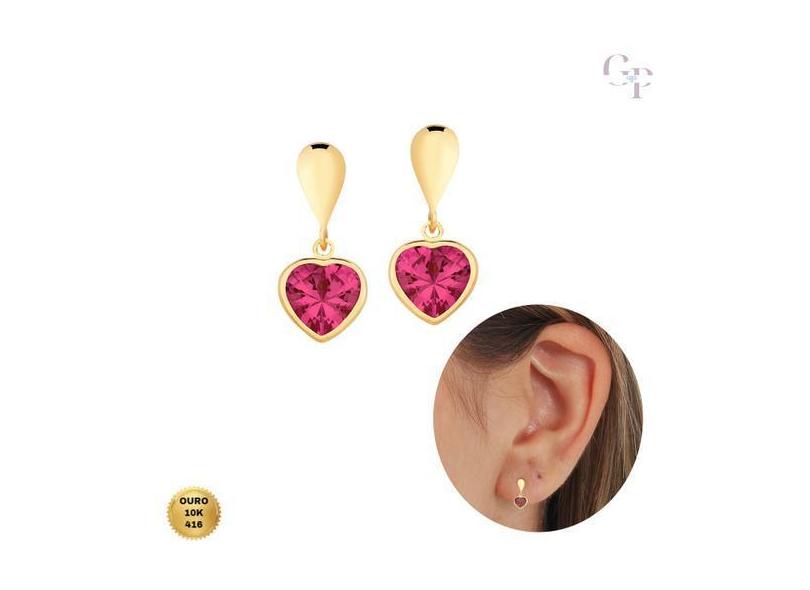 Brinco De Ouro 10K Com Pingente De Coração Pedra Vermelha 6mm Infantil