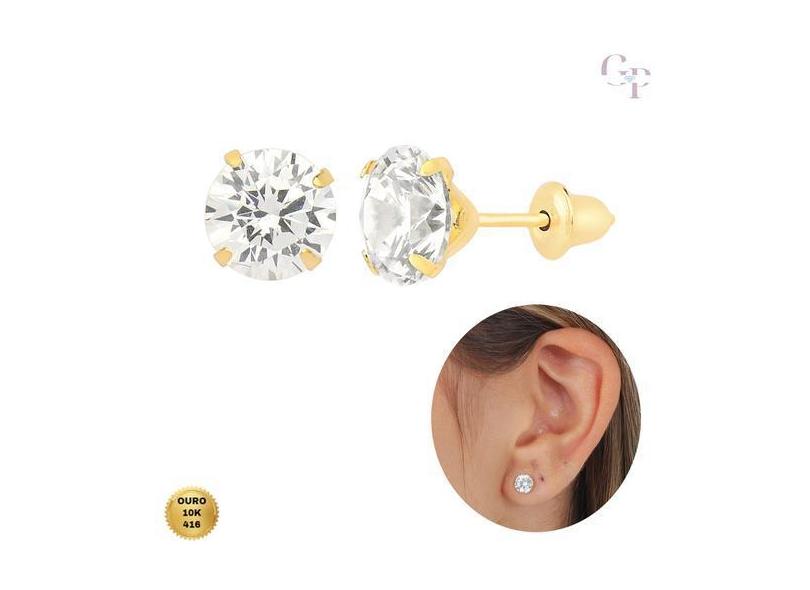 Brinco De Ouro 10K Zircônia Branca Transparente De 6mm Infantil E Adul