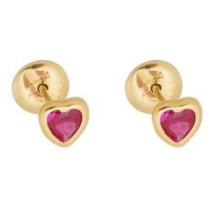 Brinco De Ouro 18K Infantil Coração Zircônia Branca Vermelho Rosa - Ae