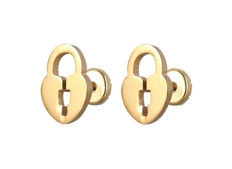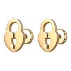 Brinco Infantil Ouro Aço Cirúrgico Cadeado Coração - Dourado