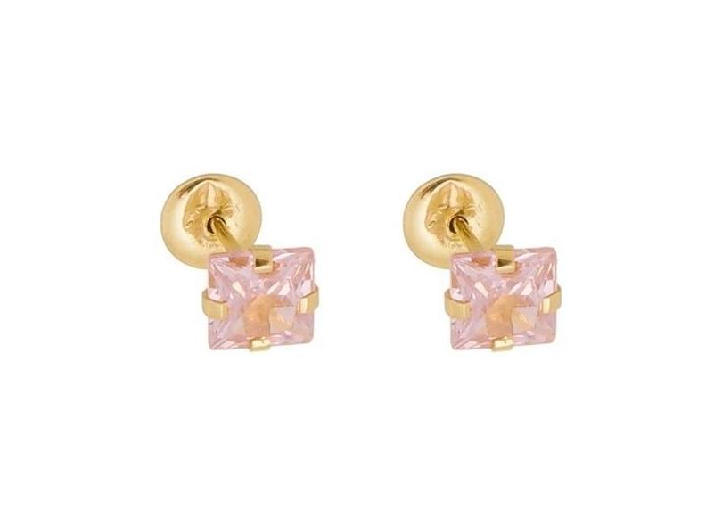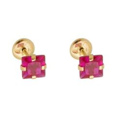 Brinco Ouro 18K Infantil Pedra Zircônia Quadrada Nas Cores Branca Verm
