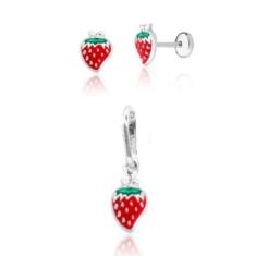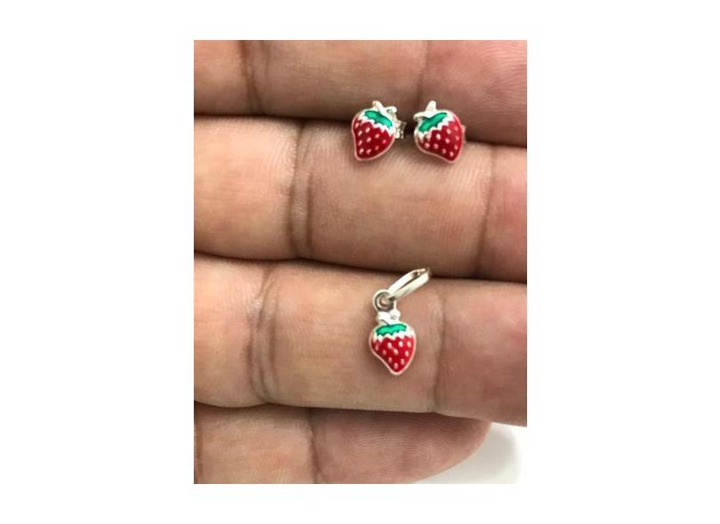 Conj. Brinco E Pingente Infantil Prata Pura 925 Morango - Lojas La&Ny