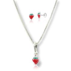 Conj. Colar Ping. Par Brinco Infantil Prata Pura 925 Morango - Lojas L