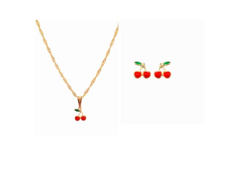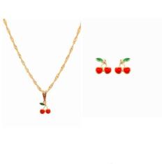 Conjunto Infantil Colar e Brinco Cereja Folheado Ouro 18k Antialérgico