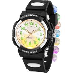 DTKID Relógio infantil com 7 luzes coloridas para meninos e meninas, relógio analógico à prova d'água de 30 m, pulseira de borracha macia, mostrador fácil de ler, aulas de tempo, relógio de pulso para