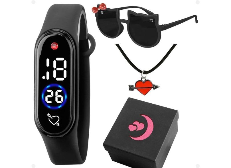 Relógio Infantil Digital Menina + Óculos Sol + Colar + Caixa Kids Acetato Prova Dágua Strass Led