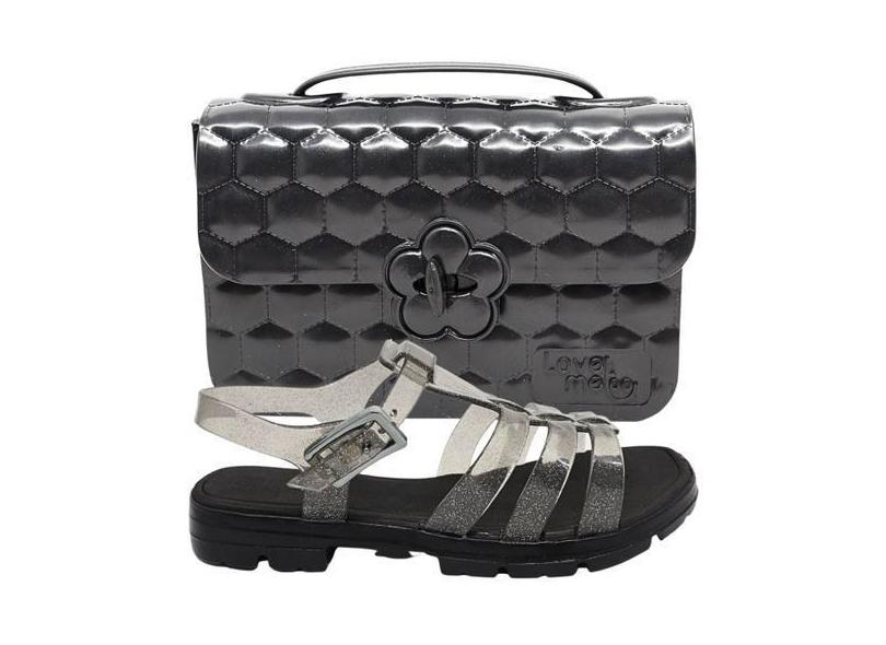 Kit Bolsa Infantil Love Me Too Preta E Sandalia Feminina Leve Macia Co