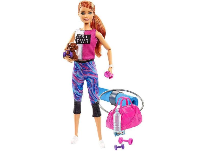 Boneca Barbie Fitness Ruiva Acessórios Cachorrinho 9 peças