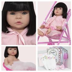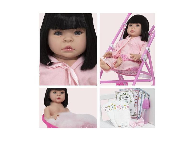 Boneca Reborn Bebê Realista Morena Pagão Rosa + Carrinho - Cegonha Reb