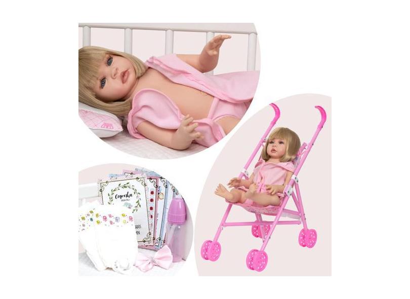 Boneca Reborn Loira Com Carrinho Kit 13 Acessórios Enxoval - Cegonha R