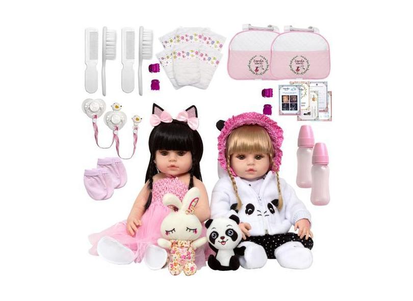 Boneca Reborn Meninas Gêmeas Enxoval Completo Panda Coelha - Cegonha R