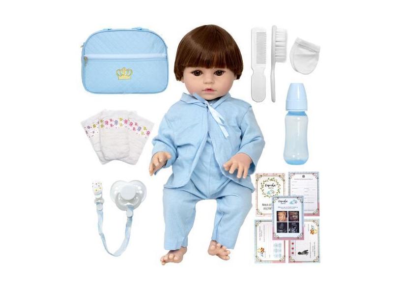 Boneco Reborn De Silicone Menino Cabelo Castanho 16 Itens - Cegonha Re