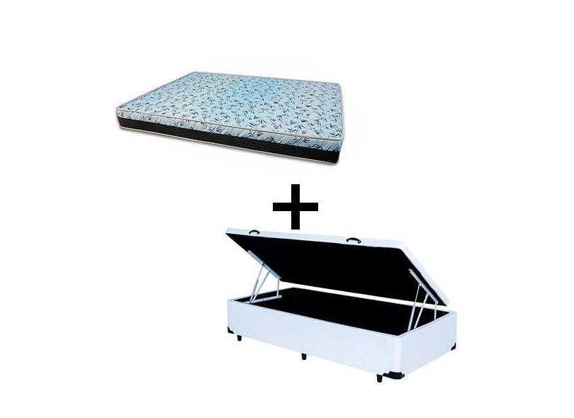 Cama Box Baú Solteiro 88 - Tecido Sintético Branco com Colchão Berlim Bello Box - D23 Azul 88x188cm