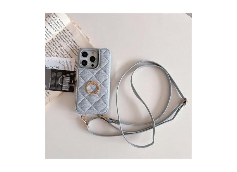 Alça de ombro carteira de couro com slot para cartão para iPhone 11 12 13 14 15 Pro Max Plus cordão capa de bolsa de telefone com anel, cinza azul, para iPhone 11