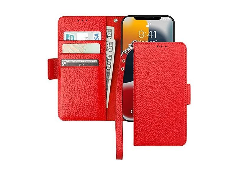 Bocasal Capa carteira para iPhone 13 5G, suporte de couro legítimo, carregamento sem fio, bloqueio de RFID, compartimento para cartões, capa dobrável com suporte para livro com alça de pulso de 6,1