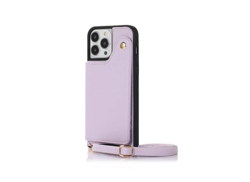 Capa carteira com alça de ombro para iPhone 15 Pro Max 14 13 12 11 Pro Max 15 Plus 13 Pro Espelho de couro com compartimentos para cartões e cordão, capa traseira, roxa, para iPhone 11 Pro