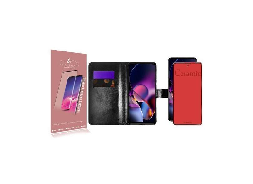 Capa Case Carteira Material Sintético Preto + Película Cerâmica Fosca