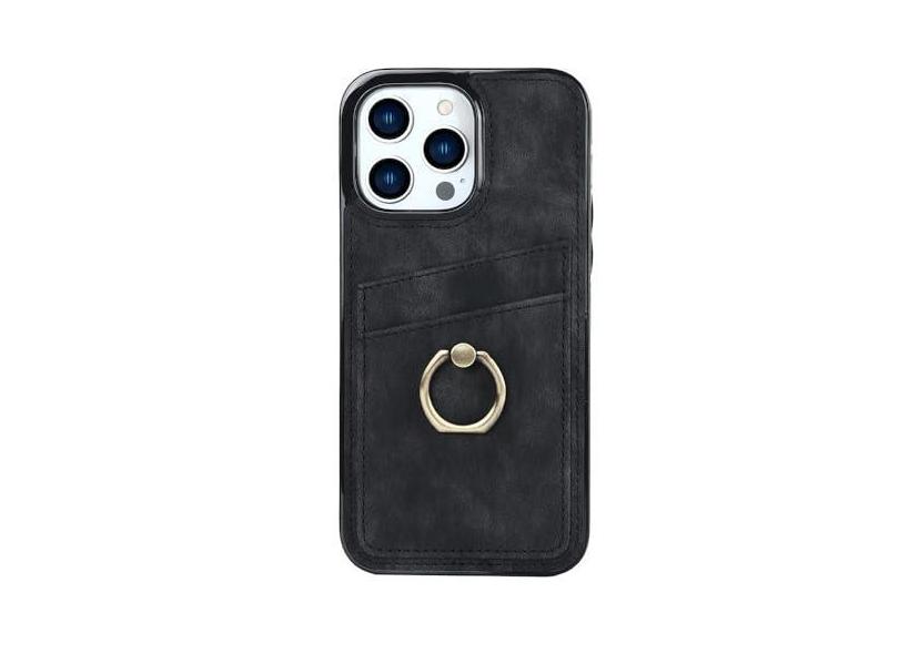 Capa de couro com anel de dedo para iPhone 15 Pro Max 14 13 12 11 Pro Max 15 Plus 13 Pro Carteira com slots para cartões Capa traseira com suporte, preta, para iPhone 13