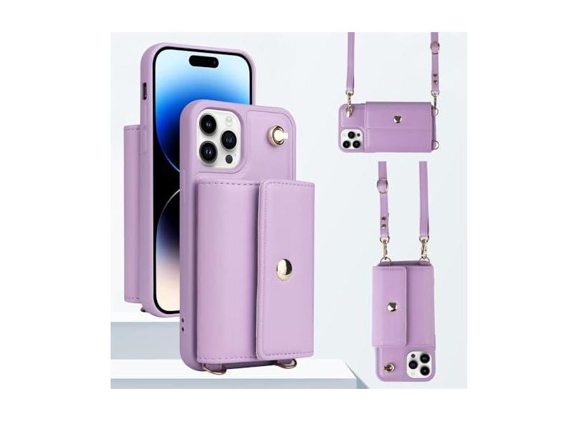 Capa de telefone com alça de ombro tipo carteira para iPhone 15 Pro Max 14 13 12 11 Pro Max 15 Plus 14 Plus Capa traseira com cordão para cartão de couro, roxo claro, para iPhone 12 Pro
