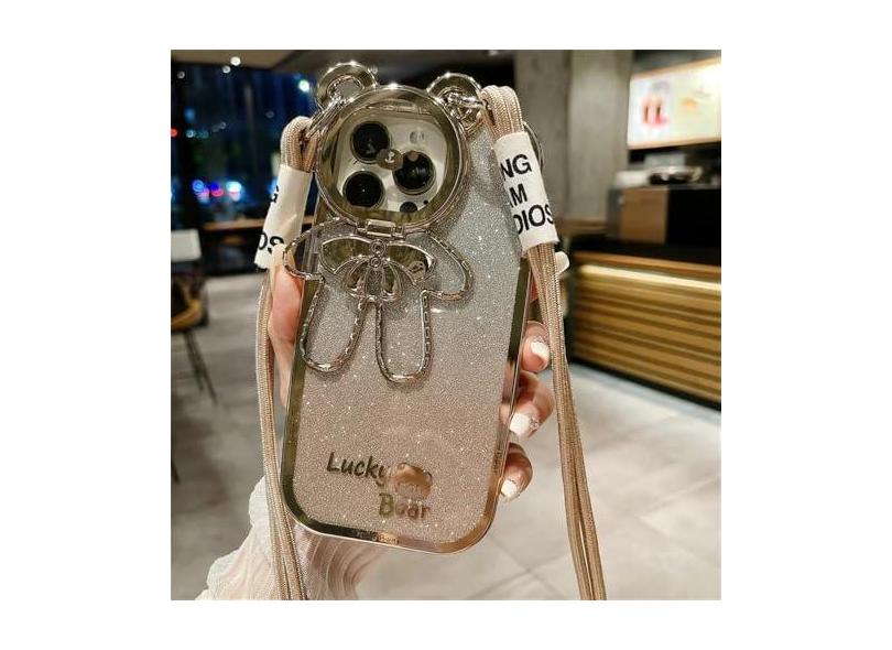 Capa de telefone com suporte de lente brilhante para iPhone 15 14 13 12 11 Pro Max XR 7 SE Capa de corda portátil crossbody, ouro gradiente, para iPhone 13 ProMax