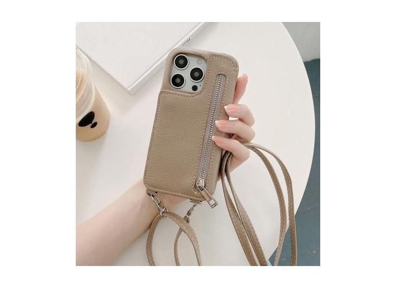 Capa de telefone com zíper carteira espelho de maquiagem crossbody cordão para iPhone 14 Pro Max 13 12 11 XR XS 7 8 Plus capa de couro com bolso para cartão, cáqui, para iPhone 12 Pro Max