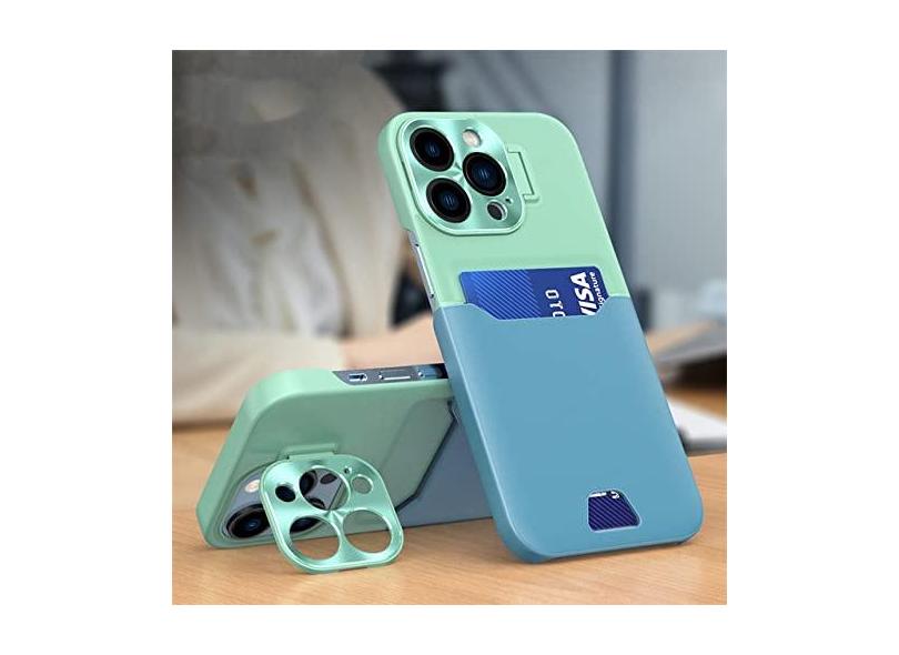 Capa de telefone de suporte de cartão de couro de luxo com suporte invisível para iPhone 14 13 12 Pro Max Mini Capa protetora de lente de metal, verde menta, azul lago, para iPhone 12 Mini