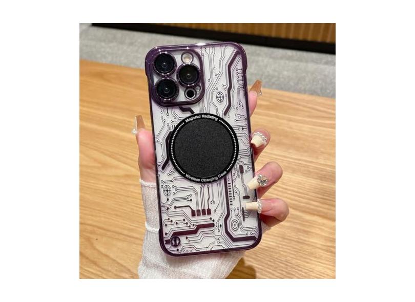 Capa magnética ultrafina com padrão de circuito sem moldura para iPhone 11 12 13 14 Pro Max 14Plus Capa transparente revestida de luxo, roxa, para iPhone 12 ProMax