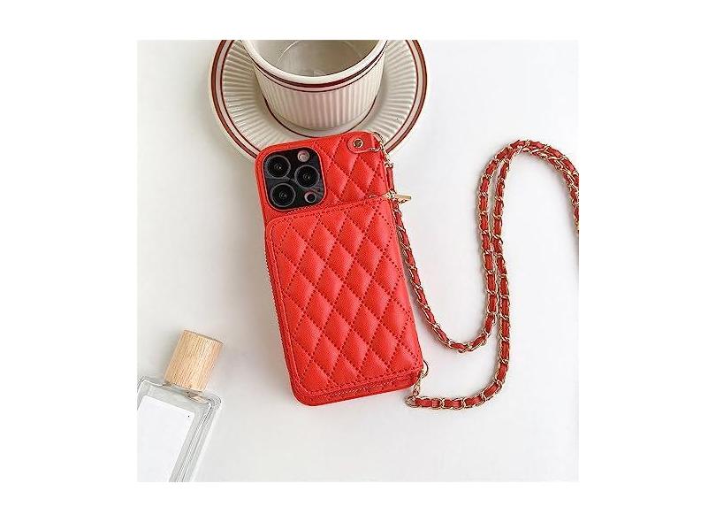 Capa tipo carteira transversal para iPhone 14 13 12 11 Pro Max Slot para cartão Lanyard Corrente Alça Bolsa com zíper Bolsa Capa de couro, vermelha, para iPhone 13
