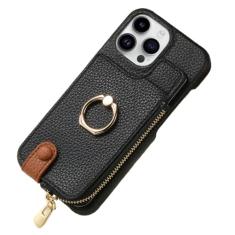 Carteira de couro com zíper e porta-cartão capa de telefone para iPhone 13 12 Mini 15 14 11 Pro Max XS XR X 7 8 Plus Capa com suporte de anel, preta, para iPhone 12Pro Max