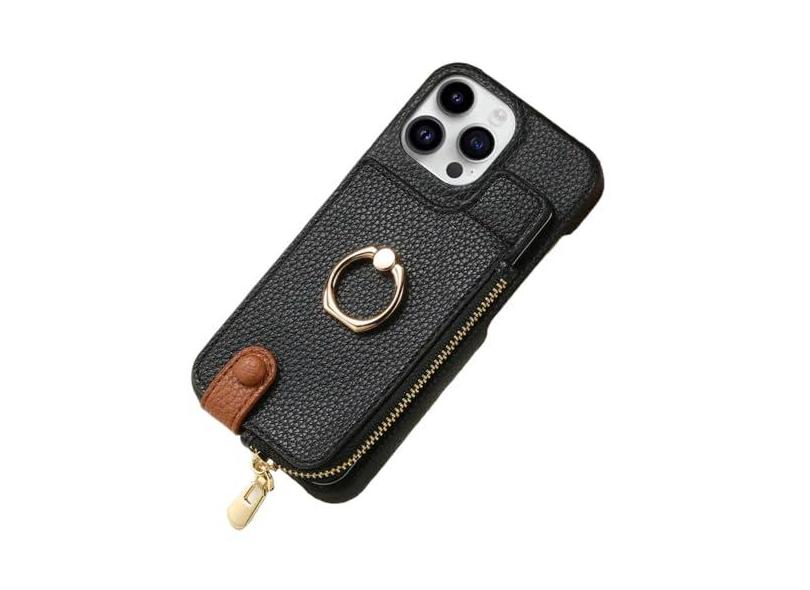 Carteira de couro com zíper e porta-cartões capa de telefone para iPhone 13 12 Mini 15 14 11 Pro Max XS XR X 7 8 Plus Capa com suporte de anel, preta, para iPhone 15 Pro