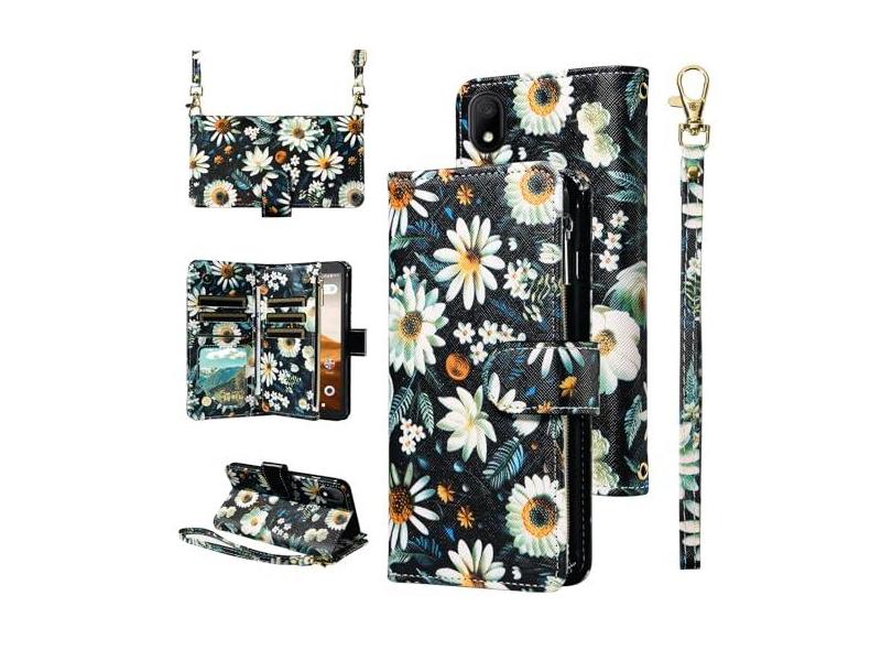 Furill Capa carteira para Alcatel Apprise/Glimpse/Volta/1B (2020) com alça de pulso alça de ombro transversal flor couro zíper bolsa suporte para cartão capa de telefone 5002R 5002C 5002E 5002L