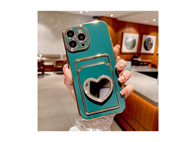 Glitter strass amor coração espelho chapeamento carteira cartão caso para iphone 14 13 11 12 pro max xs x xr 7 8 plus se capa macia, verde escuro, para iphone se 2022