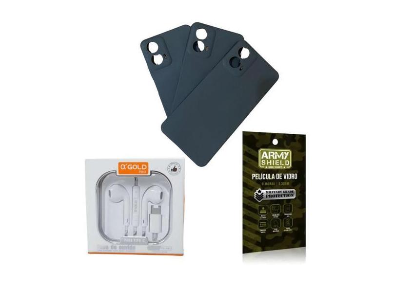 Kit Capinha Preto Para Moto G34 + Fone Tipo-C + Pelicula 3D - Armyshie