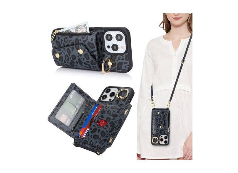 Lipvina Capa para iPhone 15 Pro com suporte para cartão e alça - Bolso com zíper, alça transversal, suporte para cartão de crédito, anel de suporte, linda capa carteira de telefone para mulheres
