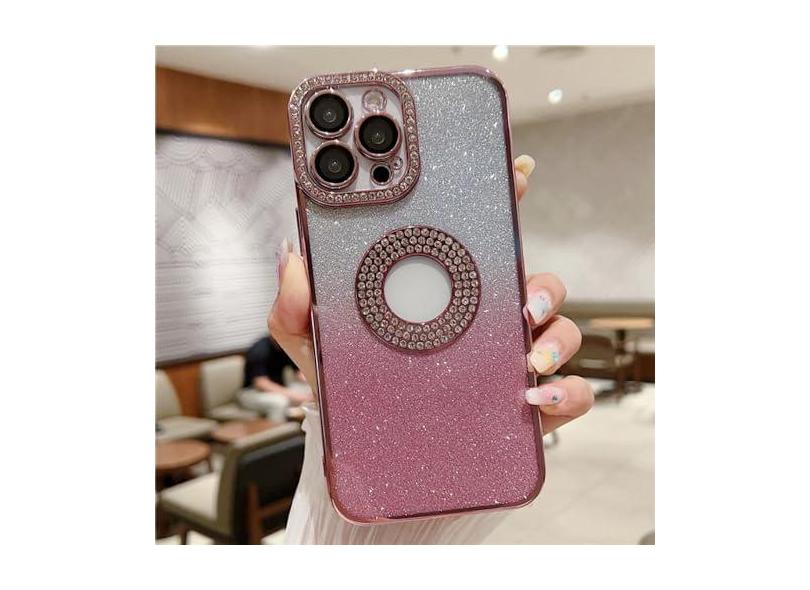 Para iPhone 15 Pro Max Revestimento de luxo Gradual Flash Diamond Frame Capa de telefone para iPhone 11 12 13 14 15 Plus Capa protetora de lente, capa revestida rosa, para 15 Pro Max