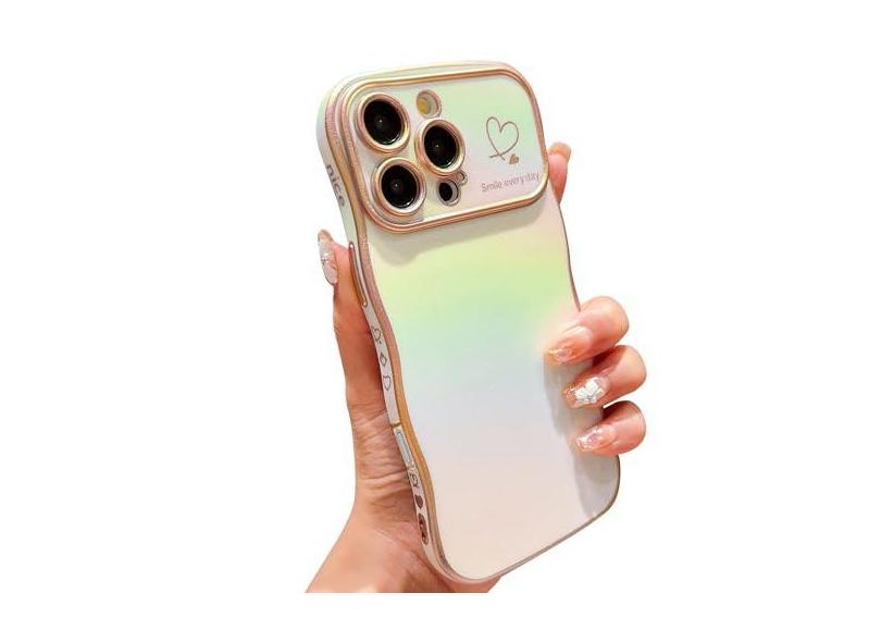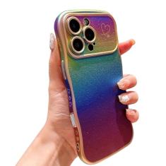 phylla Capa de telefone para iPhone 16 Pro Max 5g 17.5 cm linda moldura ondulada encaracolada luxuosa banhada a laser iridescente amor corações padrão arco-íris capa de proteção de lente levantada
