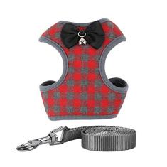 Conjunto de coleira e coleira para cães, malha macia, sem puxar, colete com sino de gravata borboleta para cães pequenos, filhotes e gatos, treinamento ao ar livre e corrida, padrão xadrez clássico
