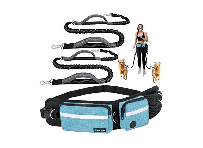 PetAmi Coleira de cachorro mãos livres, bolsa de cinto para coleira de corrida de cães para passear, correr, bolsa de cintura de cachorro com zíper duplo com dispensador de saco de cocô, alças duplas acolchoadas e refletivas, dupla