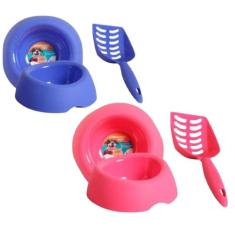 Kit Comedouro Bebedouro 600ml + Pá Higiênica Para Cachorro Gato - Plas