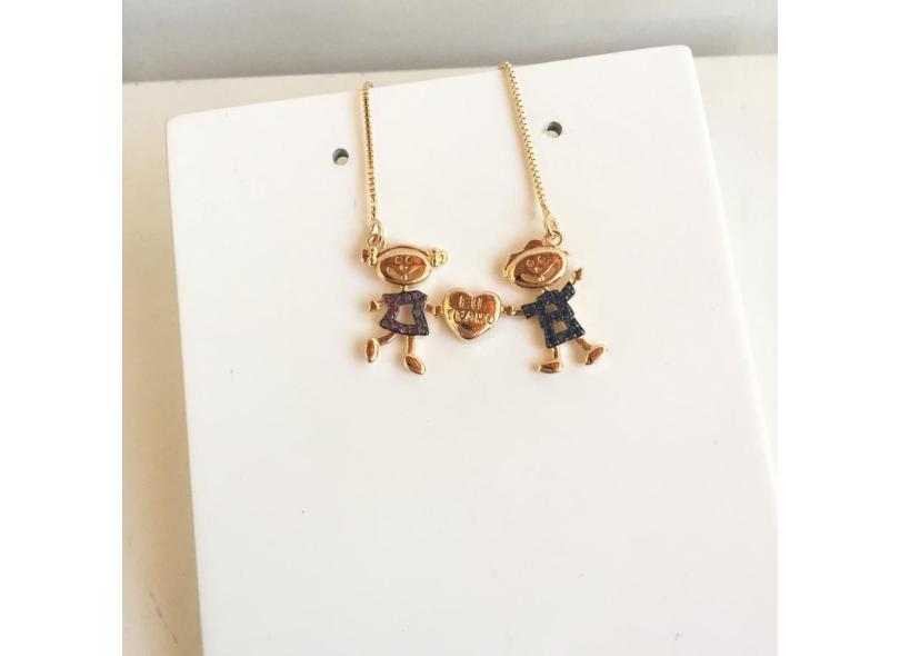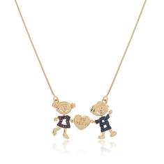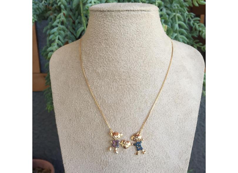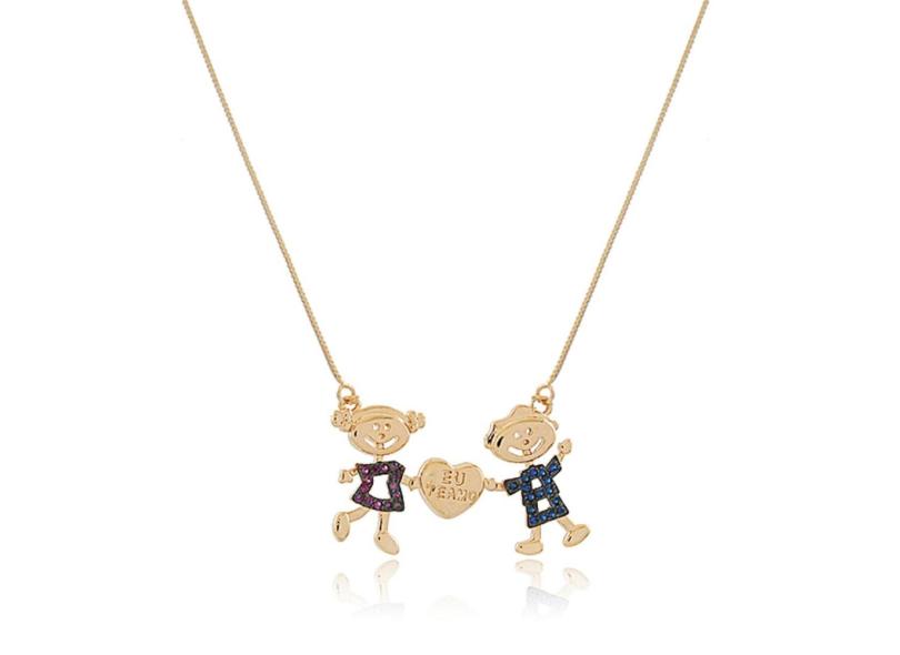 Colar Filhos Casal Cravejado Colorido Coração Eu Te Amo Ouro