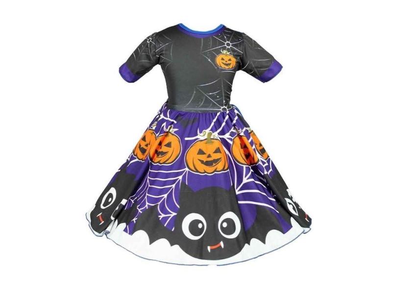 Fantasia Bruxa Infantil de Halloween Vestido Com Morcegos e Aboboras