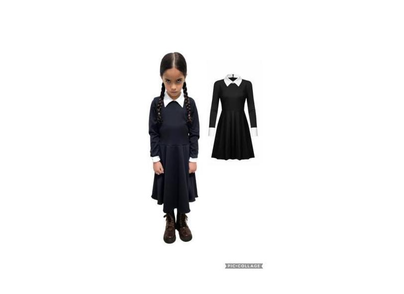 Fantasia de festa infantil com tema Halloween da Vandinha Addams - Din