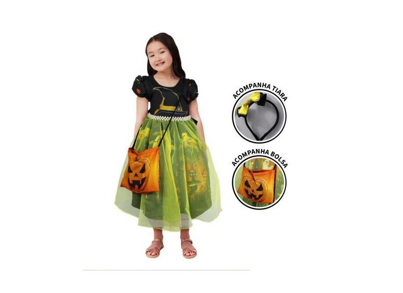 Fantasia Halloween Infantil Menina Bruxinha de Luxo Com Tiara e Bolsin
