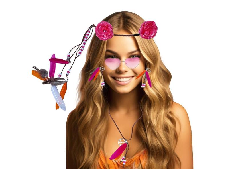 Kit Acessório Fantasia Hippie Feminina Luxo 4 Produtos - Festa Anos 70 Carnaval